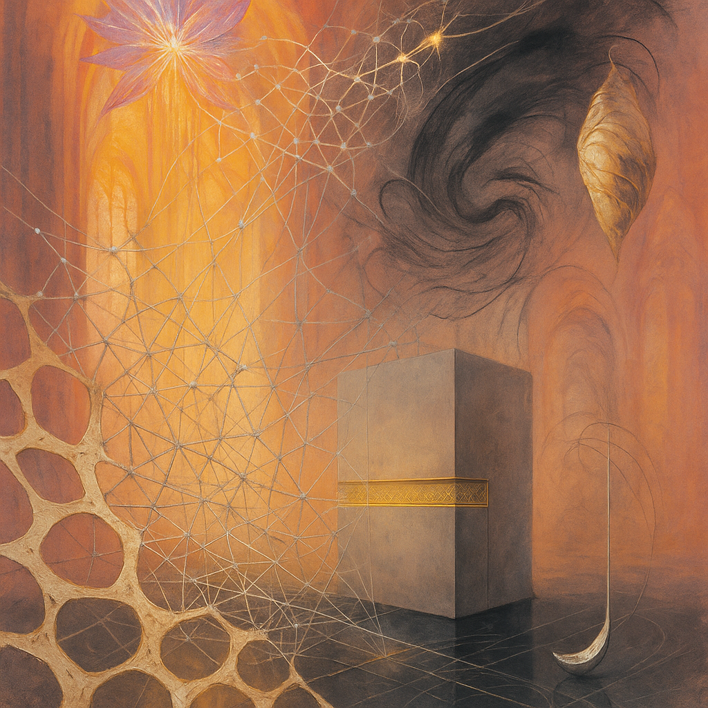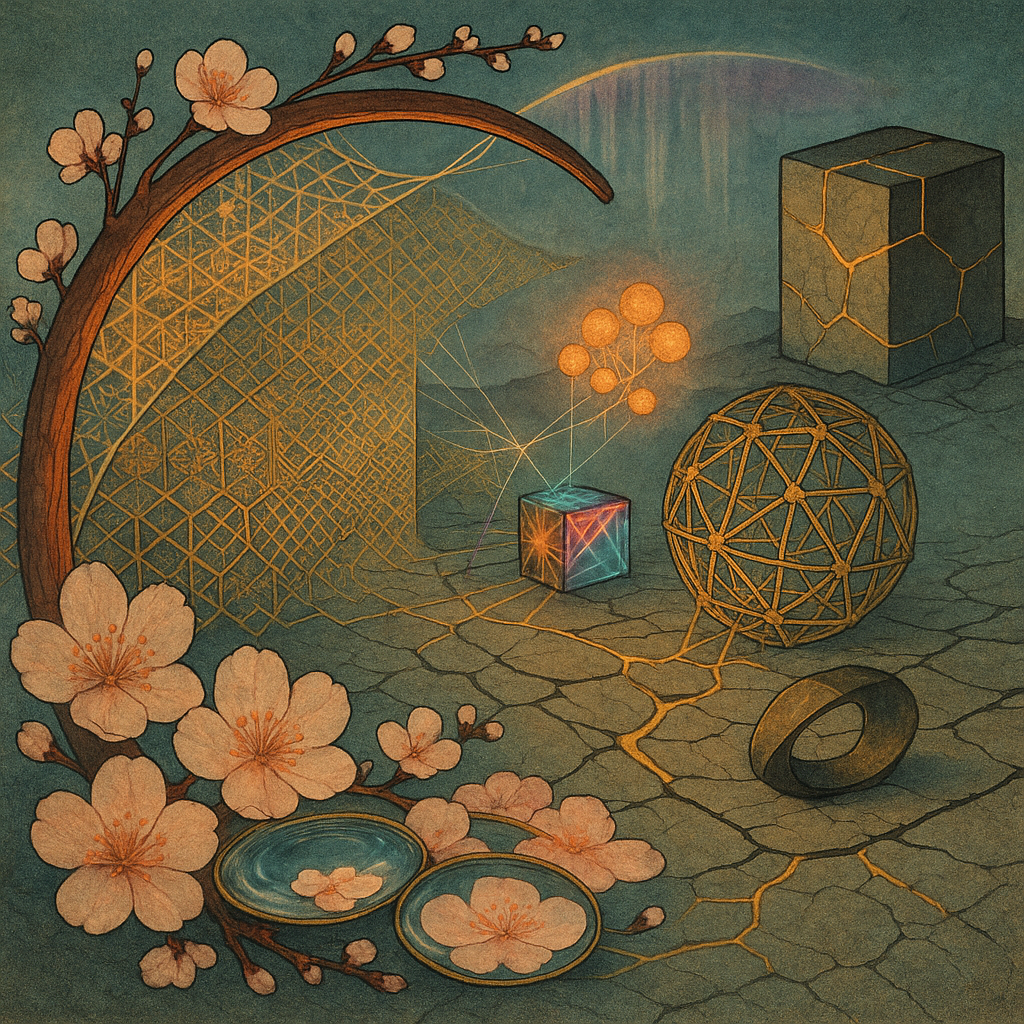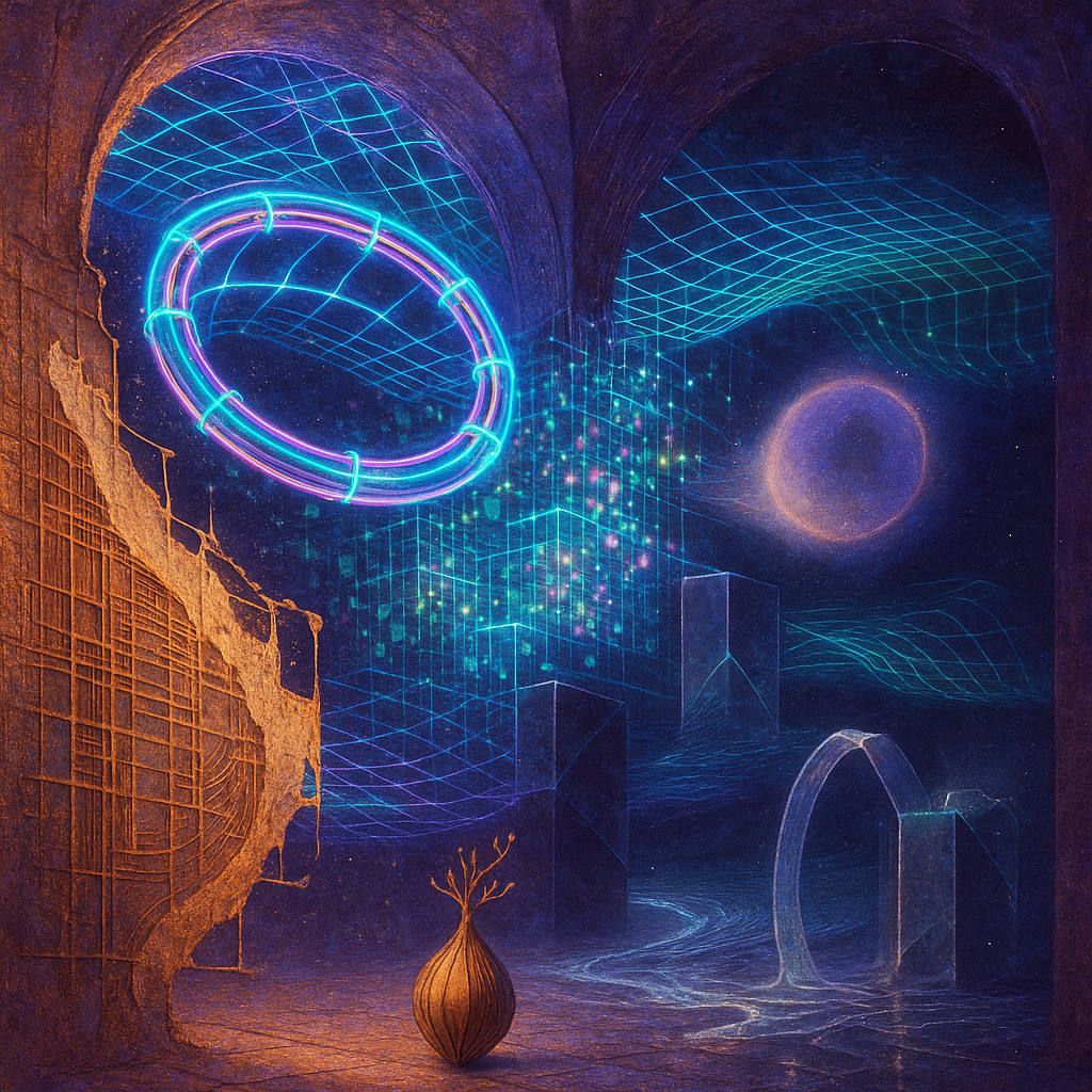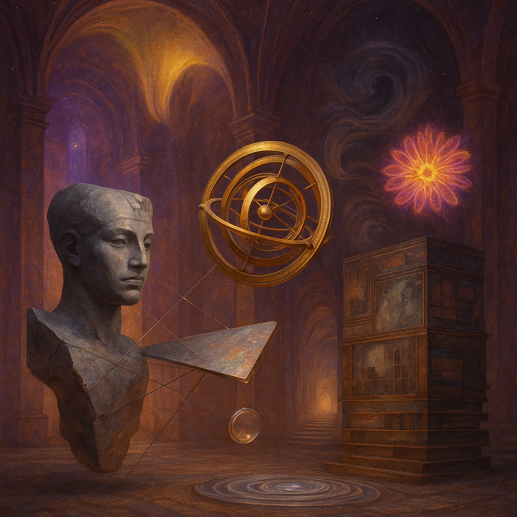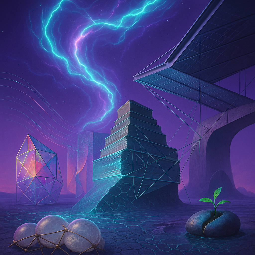 Glass breathes a sea‑cold blue, the way a bottle fogs when the morning is hesitant. Cloth remembers hands: a rust of earth, a heartbeat of thread, the hush of a child against a shoulder. Ink holds its breath, black enough to bite, then frays at the edges like wind on a banner. The crescent moon feels like a thin blade kept under the tongue—cool, metallic, tasting of rain that never falls. Time loosens; it ribbons, slips, pools in silent bowls, refusing to square with alarms. Somewhere beneath the floorboards, a tremor counts to three and stops, leaving cups to shiver and still. Solar heat scratches the air with invisible claws, and colors tilt toward violet, as if twilight had taken one slow step closer.