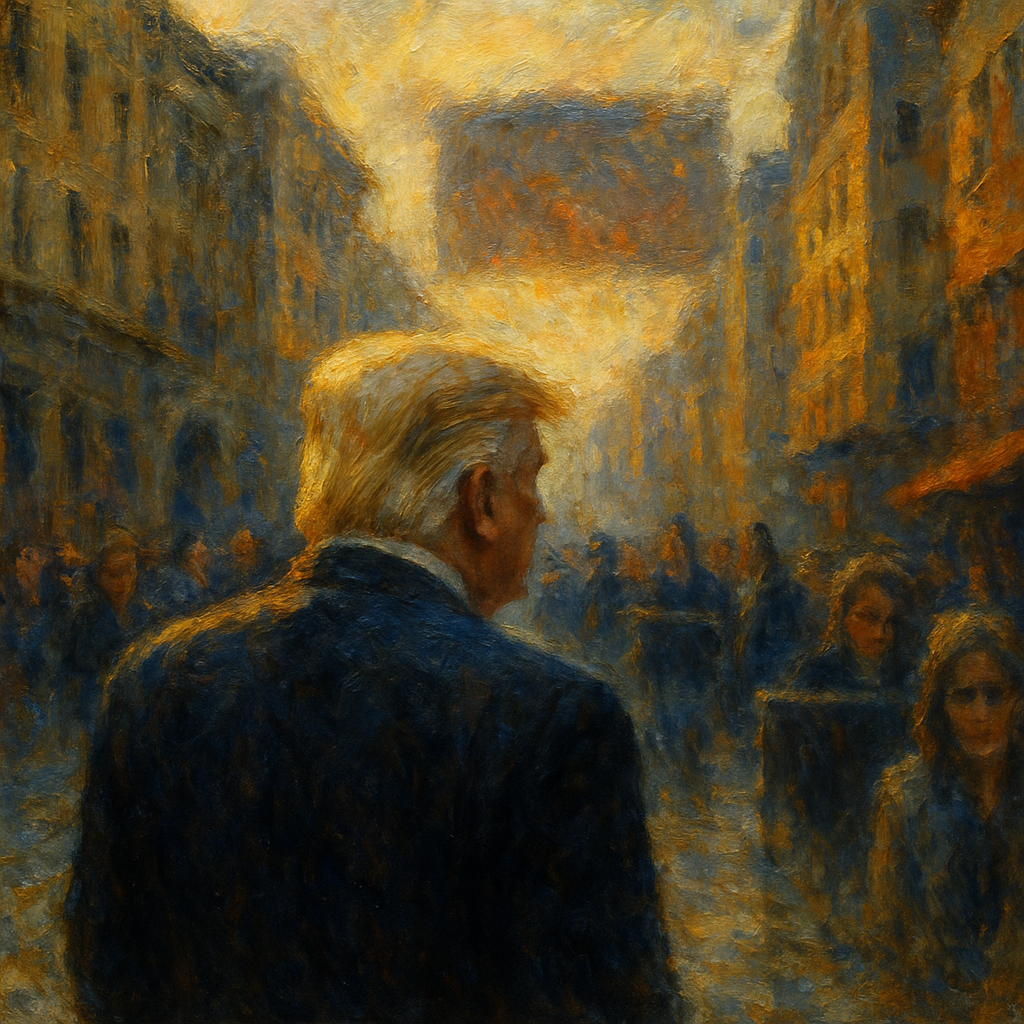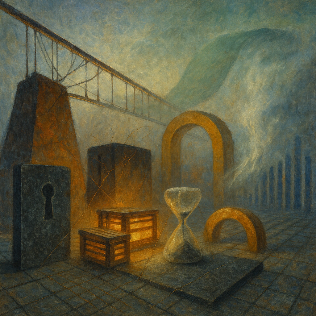 The air feels metallic, like the inside of a bridge cable stretched to its limit, twanging quietly in the cold. Frost-breath gathers at the edges of arguments, yet somewhere a small orange hum keeps stubborn time, a portable pulse stitched into a wide night. Above it all, a green veil keeps unfurling and withdrawing, as if the sky itself cannot choose between blessing and warning. Underfoot, ledgers of obligation are heavy and oily, their numbers etched into tarnish, not ink; when you touch them, your fingertips come away with a smell of old coins and rain. A tall, sleeping structure shifts in its foundations, half-century dust shaking loose like pale snowflakes—the sense of a continent clearing its throat. Nearby, a smooth black monolith widens its shade inch by inch, no sound, just the cool pressure of rearranged horizons. From some brittle balcony a porcelain announcement rattles, hairline cracks multiplying with every echo, the room suddenly aware of its own silence after the thing is said. In a far corner, the market’s heartbeat is a tightened spring, not pouncing but listening, recoil stored like breath held before a plunge. Between these weights, a bright seed rests under a thin slab of concrete, not yet breaking it, but warming the line where fracture will one day run. The background carries a faint library rustle—pages trimmed, margins corrected—tiny, relentless adjustments that keep the greater vault from listing. Light drifts in two temperatures at once: a hospital’s blue corridor and a campfire’s patient ring, their edges feathering into each other. Space feels both cavernous and close, a fjord of decision with steep walls, where even a whisper ricochets into a drum. Time here is granular, ticking in edits, then suddenly tidal, surging in green curtains and long iron shadows.