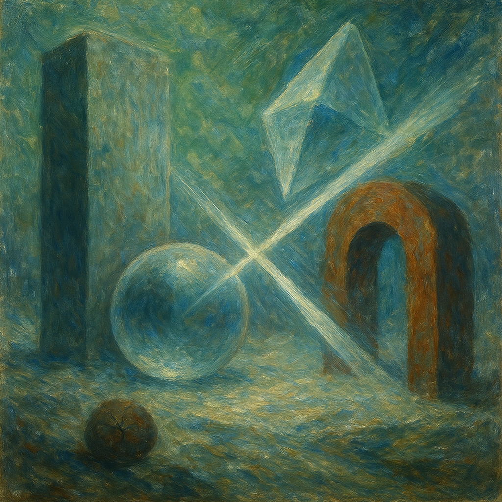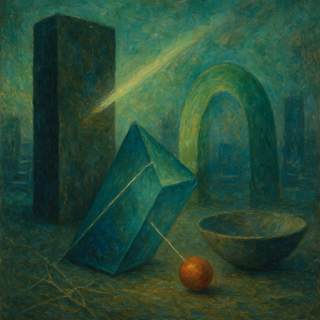 The air feels strung like wire, a taught hum threading through a chamber where every surface is listening. Underfoot, something softer keeps pressing upward, a damp insistence that remembers rain even when the ceiling holds to its dry, official posture. Voices do not speak so much as ring, a glass-tinged resonance that swells, thins, and returns as if the walls practiced echo for a living. Heat arrives in parcels, not as summer does, but as small, stubborn hearths burning in the cold corridors of consequence, orange breath licking the edges of metal skins. Overhead a green curtain moves without touching, a slow river of silk spilling its hush over tense hardware, tinting the steel with an unlikely tenderness. Across the span of the room a bridge inhales and will not exhale; its cables hum with a posture that refuses to decide, the entire weight of passage gathered in its ribs. There are pages here, stacked thin as mica, turning themselves without hands, annotations sliding like fish in a deep archive, all margins and corrections murmuring with civic weather. The floor remembers the dark, water cupped in a vessel of soot, grief settling in layers that a fingertip would smudge into a long dusk. A single sphere trembles—mirror-slick and bound with hair-thin rings—its surface quivering at every distant ripple of intention, recoil and reach written in its skin. The facade opposite has stopped pretending to be whole; stone peels where iron blushes to rust, the breath of time getting under the paint of certainty. The unseen lattice between pillars leans forward, exhaling warmth along copper paths, a vascular whisper that turns absence into function. Somewhere in the grout, a seed-shaped pressure finds the hairline cracks, promising a green sentence in a language the tiles tried to forget. The light does not settle; it migrates, gathering in crescents and draining into corners, revealing a choreography of patience and interruption. Every rhythm is punctured: quick edits, faster rumors, a delayed crossing, a sudden auroral sigh, the room switching between heartbeat and held breath. And yet, in the tensile quiet after the clamor, the space tilts toward a faint alignment—thin threads catching, small fires holding, the cold glass learning to carry warmth without shattering.