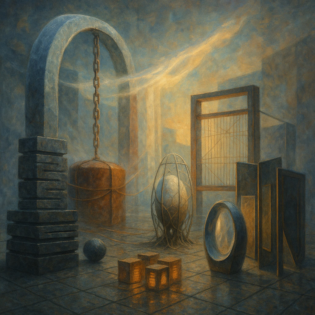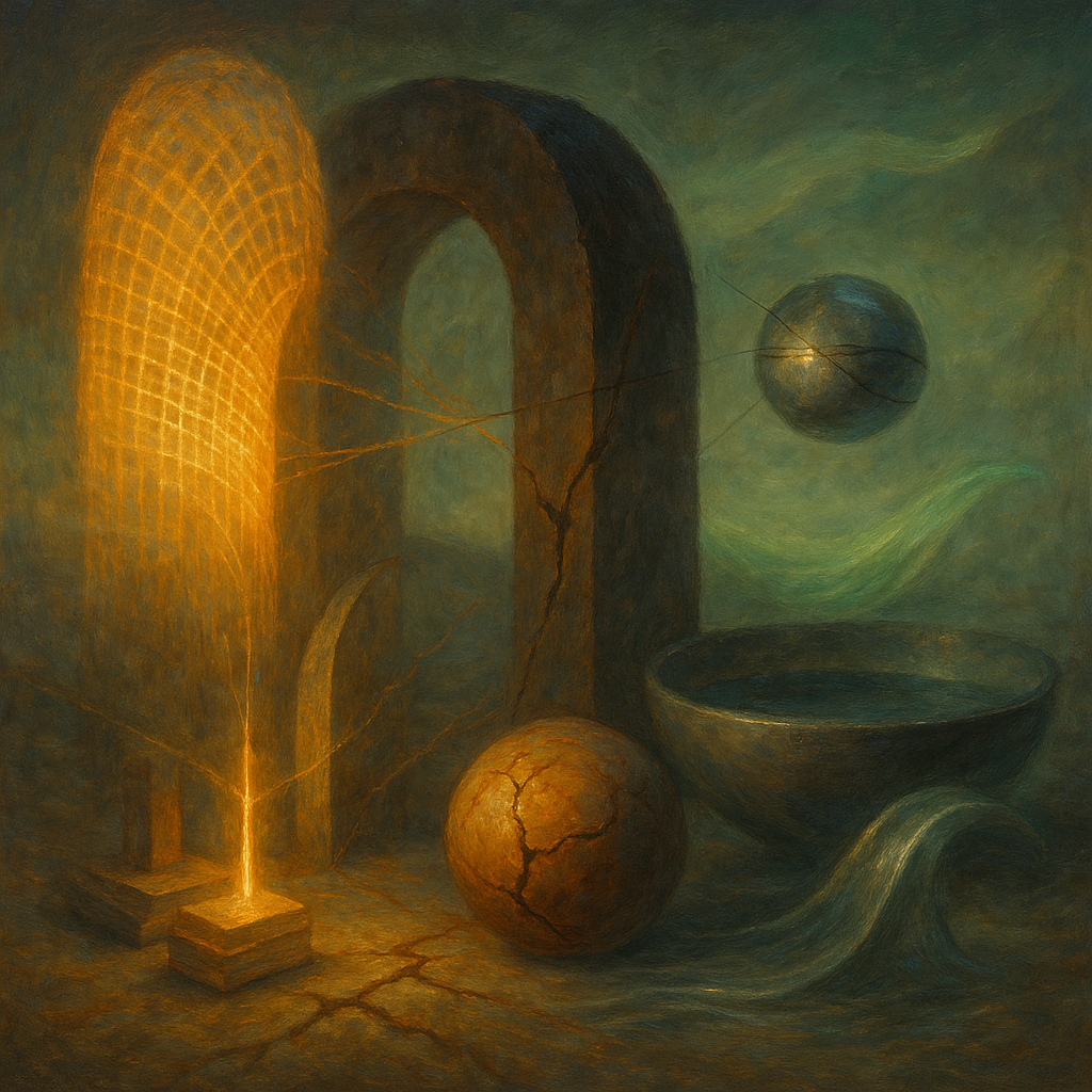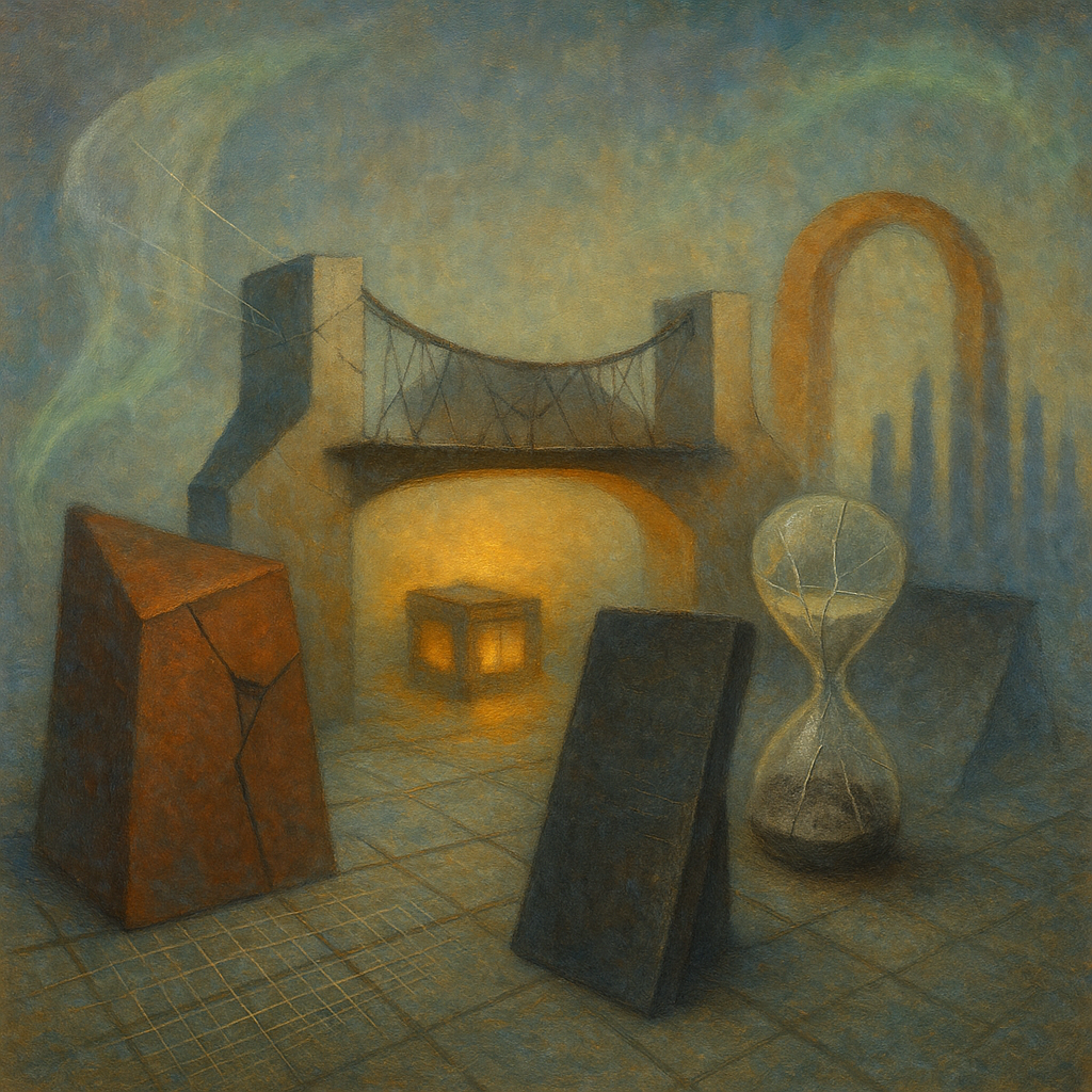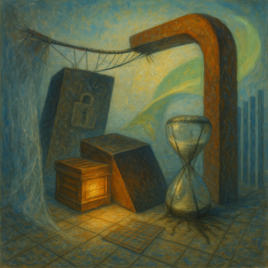 The air feels metallic and taut, like a cable that has been overtuned and now sings with a faint ache. A suspended span hovers between shores you cannot see, its deck a narrow breath, its cables whispering with frayed filaments where insistence has rubbed against patience. Below it, a ledger stone leans, numbers gouged so deep they hold a cold, chalky dust that smears the fingertips of any gaze that lingers. From wooden vessels comes a pulse of warm light, domestic and steadfast, a hearth-energy that tries to seep across the gap, softening the steel’s winter. Nearby, an hourglass with a hairline crack exhales its measure in dry sighs, time sloughing upward and downward at once, a confusion of gravity that pricks the skin with urgency. An arch of burnished metal rises as if remembering how to stand taller, its curve catching what little sun swims in this blue-tinged room, while far off a forest of serrated columns advances in disciplined quiet, boots you only feel through the floor. A pale membrane drifts over them, accusatory and cool, thickening silhouettes into stories and turning breath into evidence. Overhead, a green silk wave travels like a low song, smoothing edges, then lifting the nape hairs with a reminder that scale can dwarf both promise and threat. Underfoot, a grid of fine copper threads hums with small hands and meticulous edits, the kind of maintenance that keeps the ceiling from sinking, the kind of work that never announces itself yet orders the noise. It is a morning that tastes of iron and paper, of warmed pine and cold stone, where negotiations are weights, not words, and every surface carries a memory of the last touch and the next demand.
