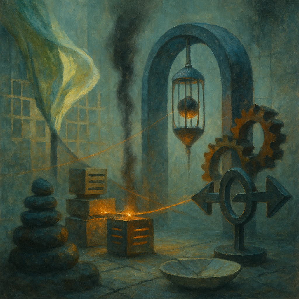 The air feels metallic and cold, like a gallery kept too bright for comfort, yet a green veil keeps sweeping over the rafters as if the sky were exhaling silk. Underfoot, a faint tremor ticks like a clock trapped in a drawer, a market of nerves trading in breaths, each inhale shorter than the last. Paper-thin layers of decisions rustle in the corners, shuffled by unseen curators who adjust edges no one will notice until the seams misalign. Somewhere deeper in the hall, iron teeth test the tension of a bridge that doesn’t want to close, the bite echoing as a dull gong across the ribs of the room. There is warmth, but it arrives in small bricks of borrowed ember, stacked with care against the draft, humming to themselves like distant engines promising temporary dawn. Accusations rise like a dark vapor column, weightless yet oppressive, staining the ceiling with shapes that look like hands reaching and failing to touch. In a clearing of the floor, stones have been stacked into careful stacks, wet with recent weather, each one holding a name not spoken aloud, absorbing the room’s murmurs with quiet gravity. A gleaming wheel grinds forward, polishing its own reflection while chewing the grain of a delicate wooden leaf, a rhythm of appetite against a rhythm of breath; the squeal threads into the bones. Signs that once pointed straight now swivel and click, redirecting passage mid-step, their glassy faces catching stray auroral greens and throwing them into impossible corridors. In the back wall, a shallow bowl of ash-colored rock remembers impacts from another sky, a silent witness crater that drinks sound and returns only the sensation of distance. The green light drapes across everything with a patient pulse, making the cold feel almost considerate, like a hand that insists you stand still long enough to notice what trembles. Shadows lengthen in geometries that don’t match their objects, as if intent and consequence had slipped out of alignment. The air smells of cold vapor and machine oil, of damp stone and thin paper, and somewhere, a faint thread of citrus from gloves that have been working all night. The space holds itself taut, like a note sustained just shy of breaking, and every surface seems to wait for a decision that keeps migrating, reframing the center of the room with each breath. Yet when the green arrives in a higher surge, the room forgets to fear and simply widens, every edge turning softer, all the weights briefly weightless, like a rehearsal for a kinder gravity.
