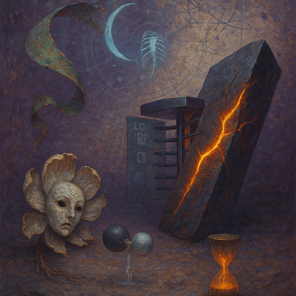 Beads glint like dew caught in a breath, while carved wood drinks shadow and releases the smell of raffia and pigment. A lattice clicks into place with soft, decisive taps, as if thought were a machine aligning its teeth. Petals, thick with paint, lean forward—too alive for their vase—leaving a faint perfume of turpentine and dusted pollen. Mist drapes the floor in moon-silver gauze, its chill threading the ankles, patient as a confessional whisper. Radio-thin vibrations skate the air, neon at the edges, a tremolo that turns corners before it arrives. Somewhere below, marble holds its breath and then gives, a thin crack letting warm light breathe upward. Far off, two charcoal pearls gather starlight the way a hush gathers intentions—slowly, insistently.