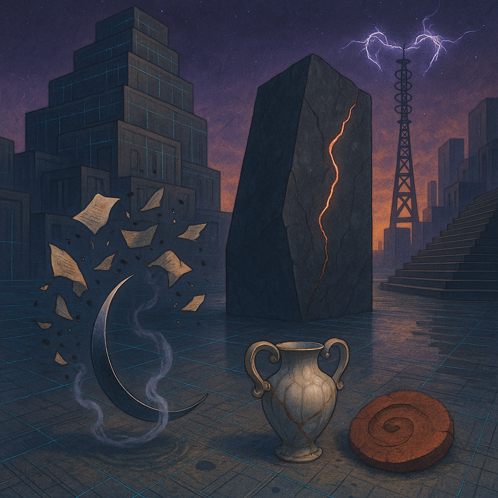 Cold air ghosts along glass and linen, a smell of graphite dust and sea salt buried in the fibers. You can feel a low tremor underfoot, the kind that rearranges cups on a shelf but leaves the shelf arguing with itself. Overhead, a faint radio-sizzle of the sun threads the sky like tinfoil torn too slowly, as if light were learning how to fray. Water climbs stone steps in careful breaths, leaving a bruise of foam and a coin-bright sheen. Porcelain blushes under hairline gold, not quite breaking, not quite whole, the sweetness of its curve sharpened by a hiss of stress. Paper scraps orbit like stubborn thoughts, edges singed, ink still damp, trying on the shape of a face before forgetting it. The night is velvet and granular, a pocket of tiny gravities tugging at the ribs of the day.