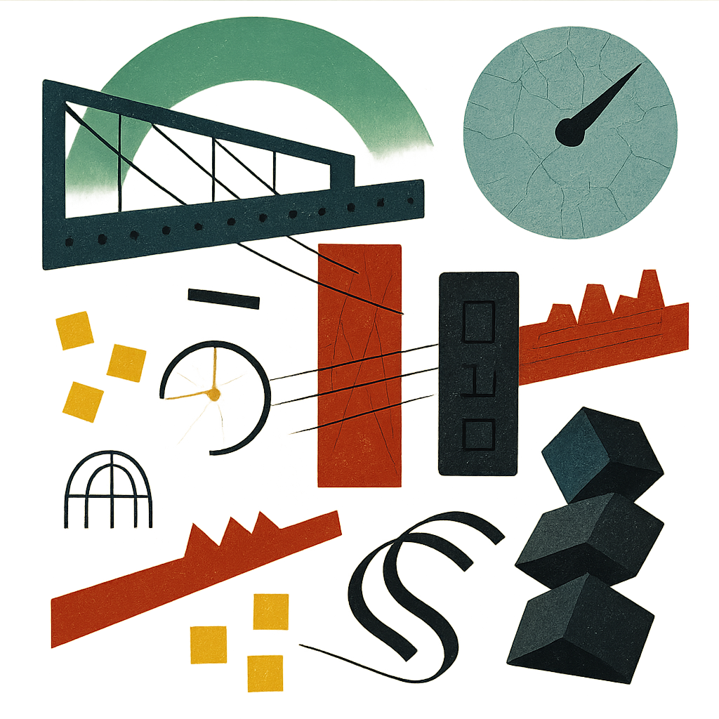 The air feels blue-steel and thinned out, like breath held too long in a cold room. Edges rasp against each other—cable against girder, brass against stone—as if every promise is being tested for hairline fractures. Heat shows up in small, stubborn pockets: a coal-bright ember under a copper lip, a thread of amber sliding through glass, defying the chill. Far off, matte silhouettes sharpen the horizon, quiet but unmistakable, pressing weight into the distance. A ledger sits heavy, tally marks cut so deep they catch the light and won’t let go, while a ribbon of public feeling twists on itself, snagging on its own pins. The floor hums with a grid you can’t quite see, a low frequency of edits, routes, and relays stitching noise into function. Suspended above it all, a cracked sphere does not shatter, not yet, though the room has learned the sound it would make.