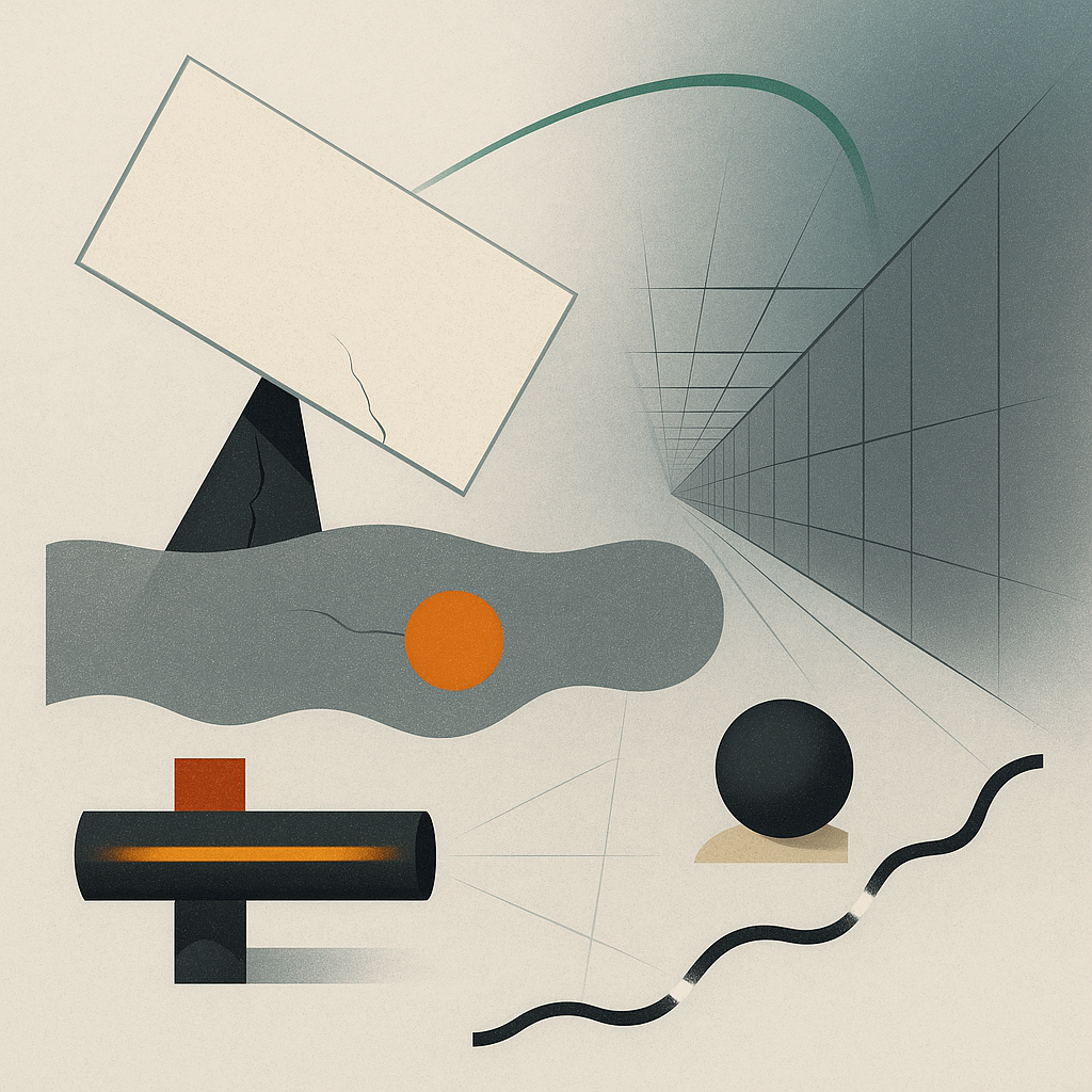 Cold metal air presses against warm, bruised light, like a breath held too long in a glass lung. Edges quiver—polished, razor-thin—while underneath, a soft granular drag pulls everything toward a quiet drain. Signals arrive as flares, then fade to ash-smoke lace, leaving afterimages that hum like distant machinery behind the ribs. Heat gathers at the margins, an amber fever licking the blue steel of caution, where words condense into frost and then bead into rain. Structures tilt mid-syllable, promises sloughing into filings, filings knitting into wire, wire unraveling again. Far above, a black-pearl corona ticks and shudders, counting the seconds with molten beads. Between pushes and pauses, the room feels suspended, as if gravity were negotiating its contract.