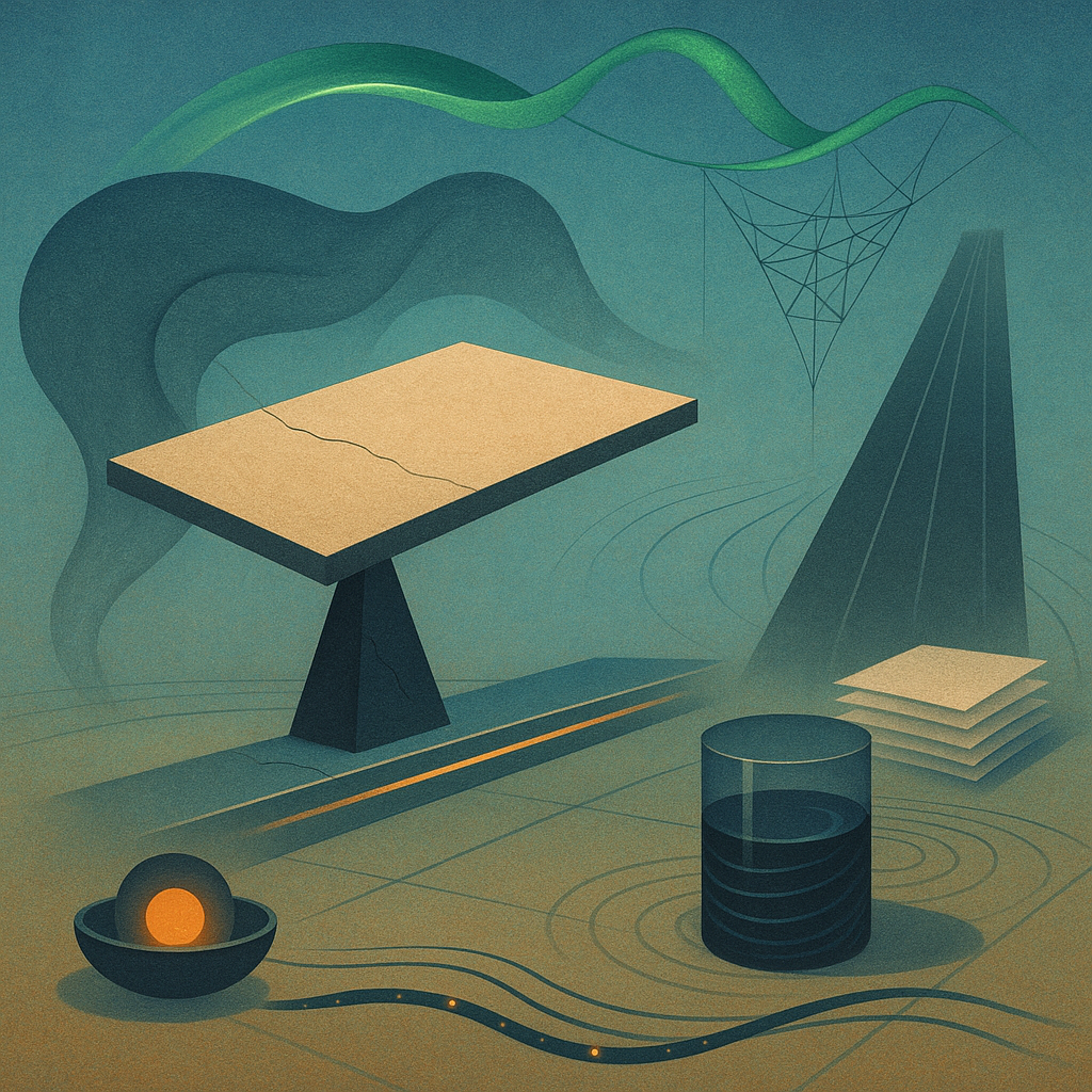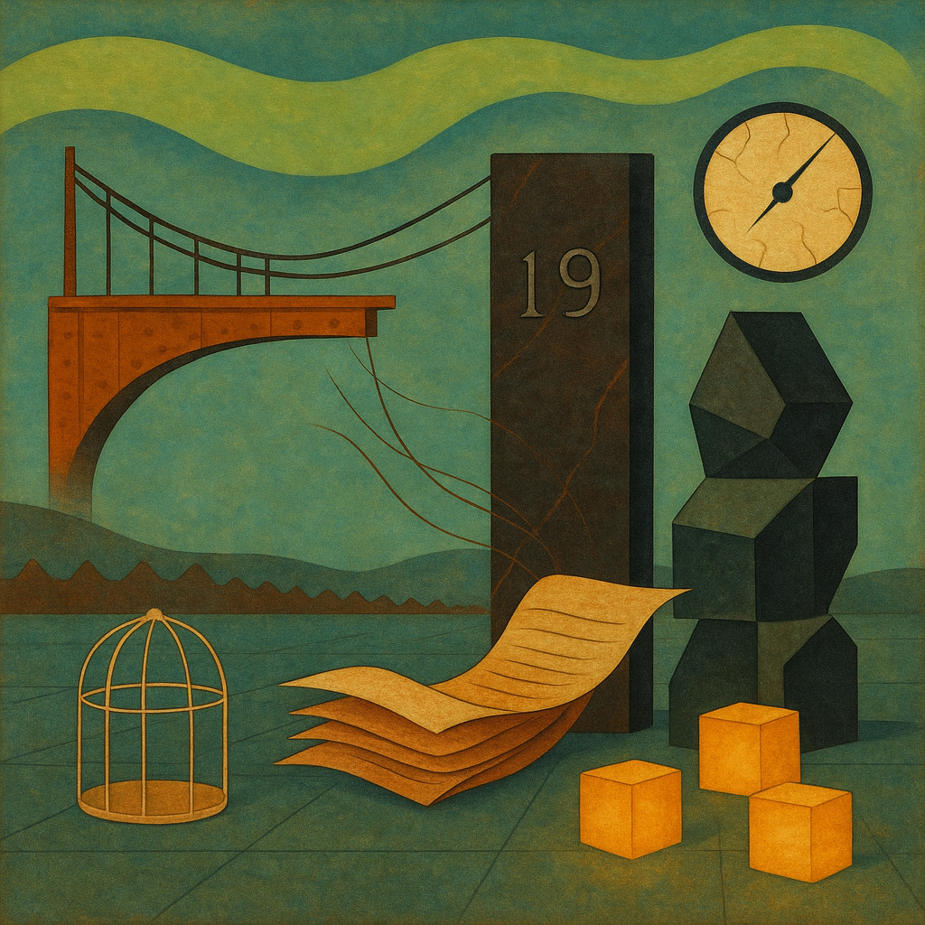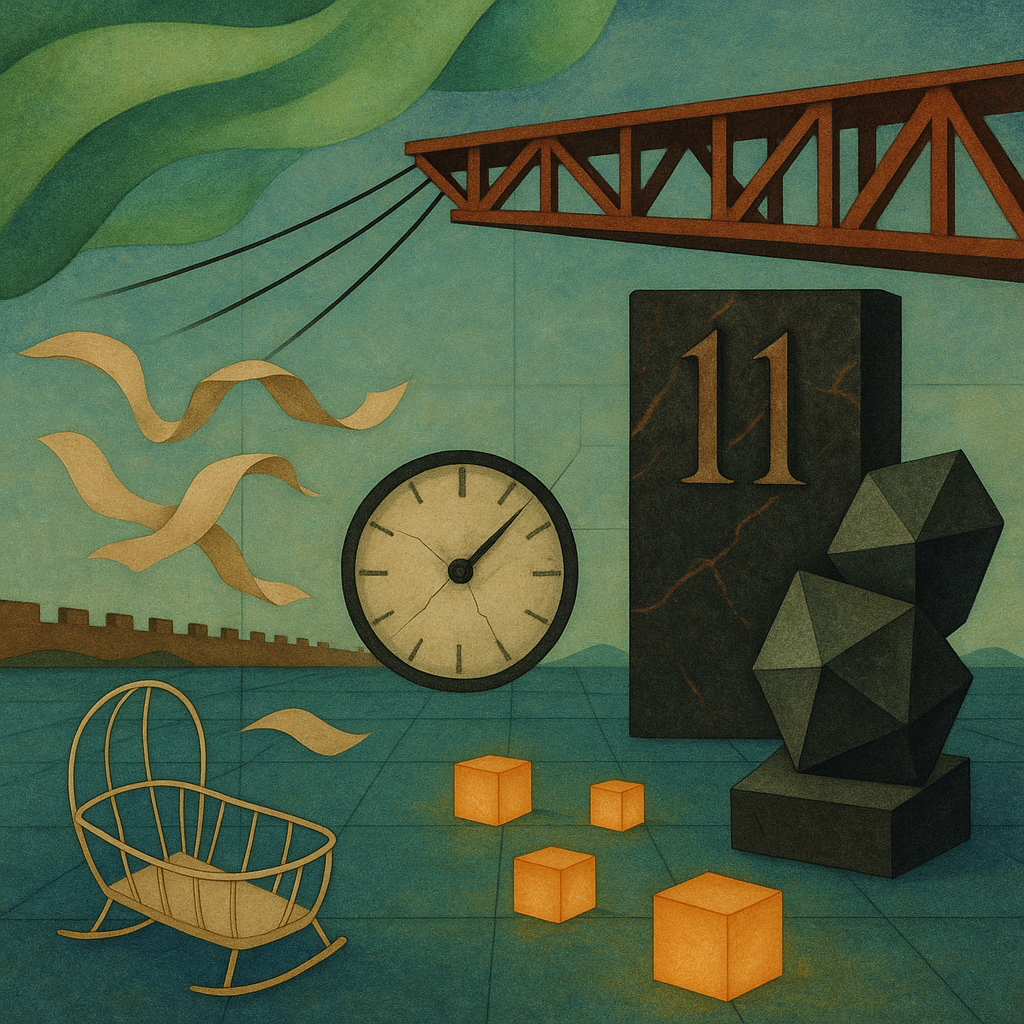 Cold circuitry hums under the skin of the hour, a tremor of rivets and distant engines tipping the air toward iron. Green firecloth ripples across the upper darkness, a soft phosphorescent breath trying to soothe clenched metal jaws below. Numbers feel heavy tonight—stone-thick—while promises creak like cables stretched past their temper. Small, square pools of warm light glow stubbornly against the draft, the smell of ozone and canvas mingling with wet rust. Paper whispers from the margins, flicking like minnows, reorganizing what counts as true while the tide of preparedness saws forward tooth by tooth. A porcelain dial holds its breath, needle shivering at the far edge, as an empty cradle-shaped absence chills the room from the future inward. Between peaks and pylons, you can hear the pause before a crossing, the weight testing every bolt of resolve.