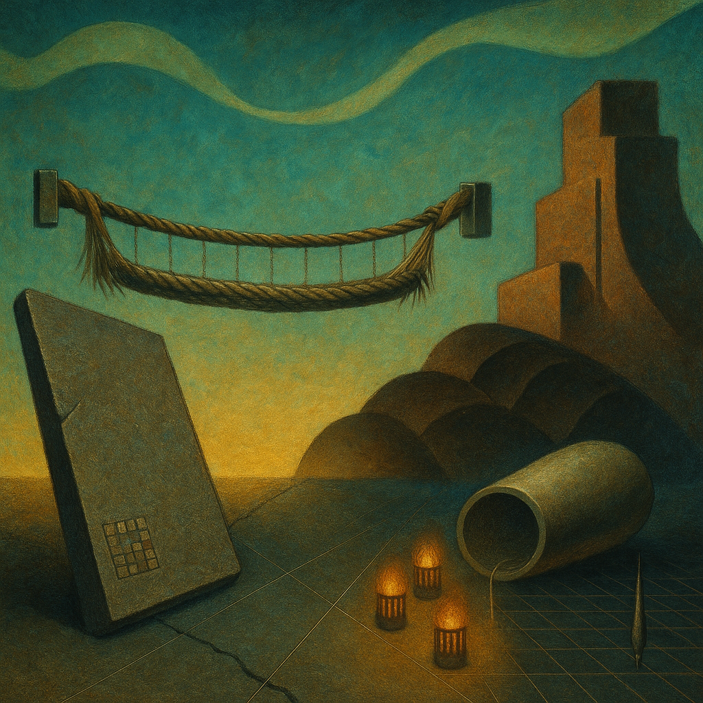 Cold metal breathes under green curtains of sky, where quiet light slips like silk over sharpened edges. Paper-thin rules rasp against iron intentions; you can hear the grit of unpaid ledgers grinding underfoot. A bridge hums with a pulled heartbeat, each cable a taught nerve between neighbors who both insist on feeling the pulse. Somewhere, warm lanterns march through the frost, carrying heat into rooms scoured by winter and glass. Far off, plates of shadow buckle and spread, a slow armor assembling in the dusk. Empty engines echo like dry bowls, waiting for a pour that never quite arrives. The air tastes of ozone and ink, the moment split between watchfulness and will.