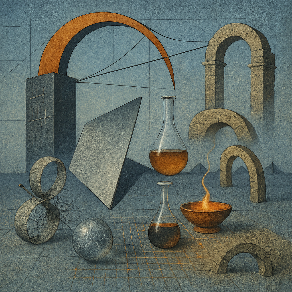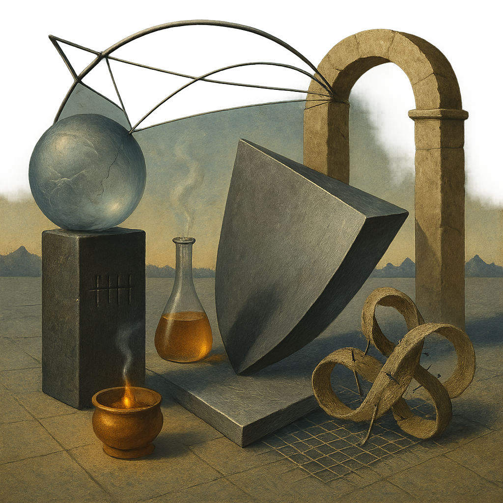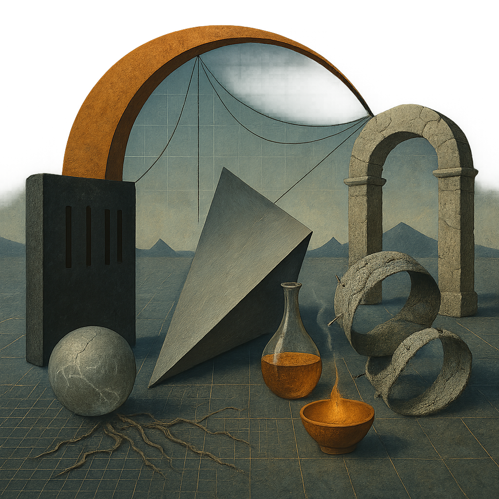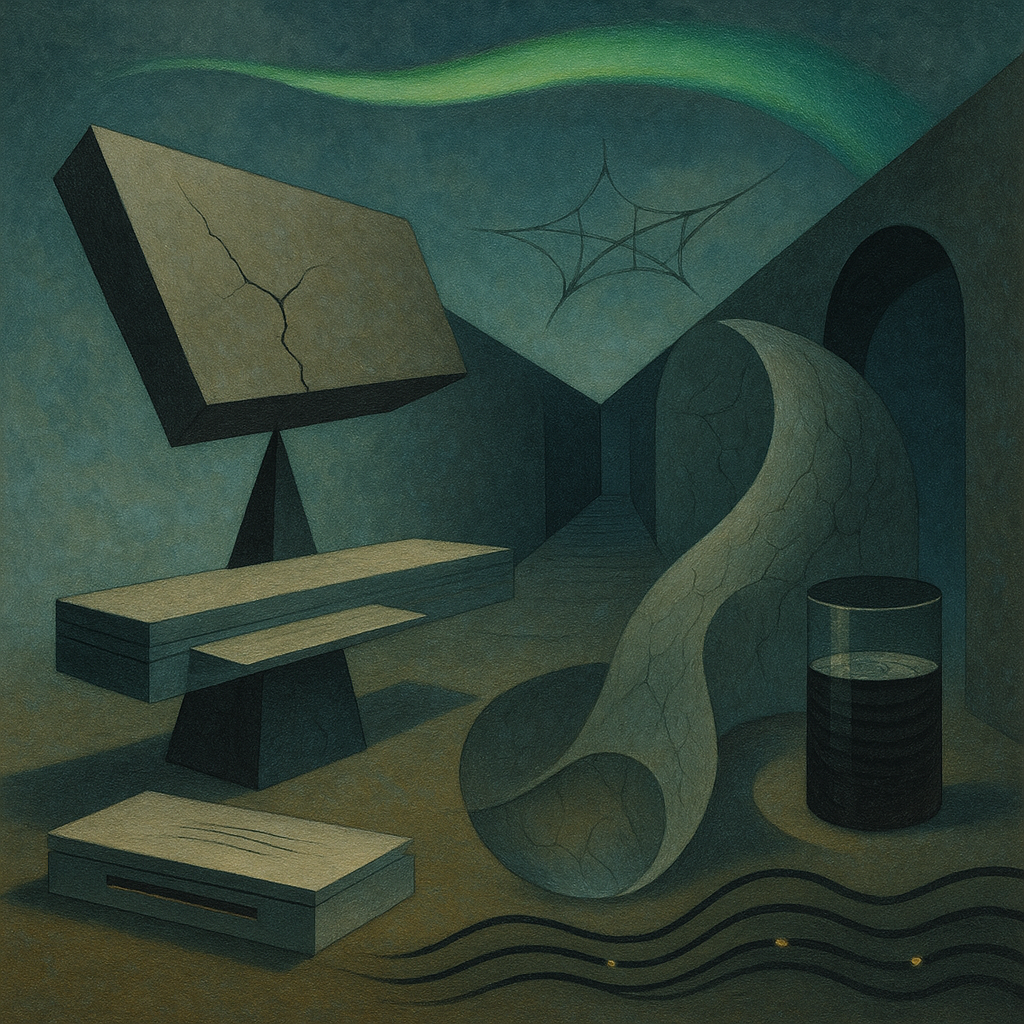 The air feels blue-steel and thinned out, like breath held too long in a cold room. Edges rasp against each other—cable against girder, brass against stone—as if every promise is being tested for hairline fractures. Heat shows up in small, stubborn pockets: a coal-bright ember under a copper lip, a thread of amber sliding through glass, defying the chill. Far off, matte silhouettes sharpen the horizon, quiet but unmistakable, pressing weight into the distance. A ledger sits heavy, tally marks cut so deep they catch the light and won’t let go, while a ribbon of public feeling twists on itself, snagging on its own pins. The floor hums with a grid you can’t quite see, a low frequency of edits, routes, and relays stitching noise into function. Suspended above it all, a cracked sphere does not shatter, not yet, though the room has learned the sound it would make.